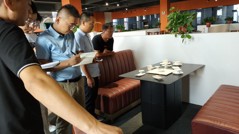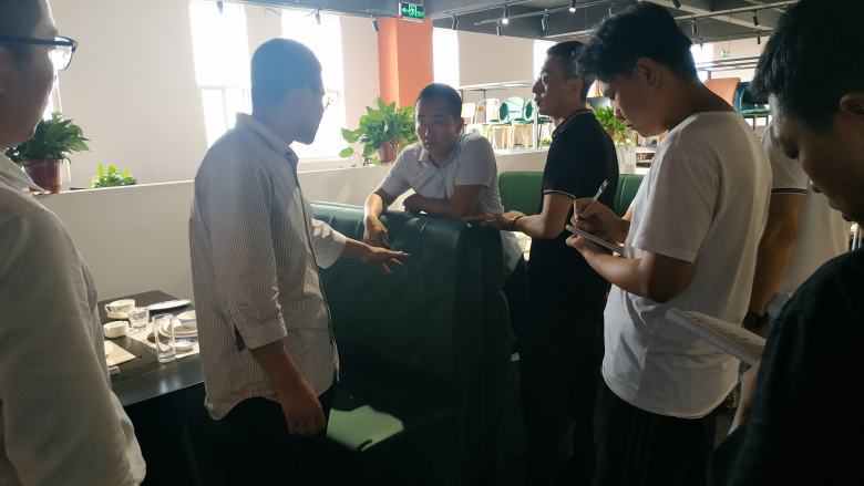 随后,周经理带领新伙伴挨个对展厅里面的餐桌椅及电动餐桌和卡座沙发做了深入讲解,现场不明白的问题新员工也都及时的得到了清晰地答复。在后面的互动环节,周经理还随机点名让新员工对展厅里面的餐桌的材质进行回答,还包括电动餐桌的尺寸计算,餐椅配备数量计算等基础问题进行了考核,大家的回答几乎都是正确的。
