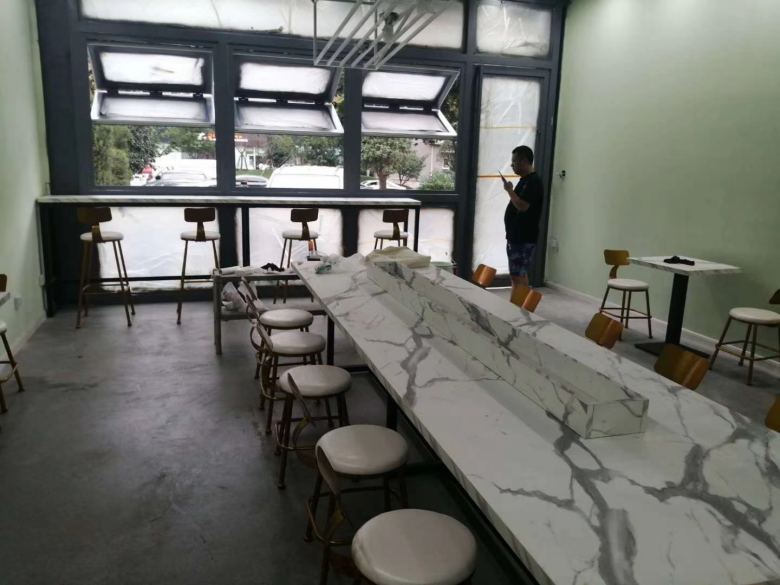 我厂承接的西安鲜螺螺蛳粉餐馆定制餐桌椅工程正式交工,家具安装完毕后,大理石台面餐桌看上去非常的上档次,客户对于我厂生产的餐桌椅给予了高度赞扬。