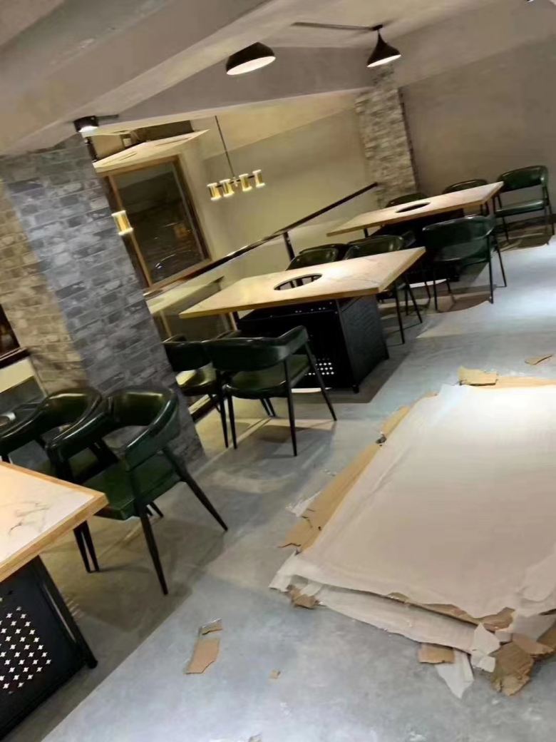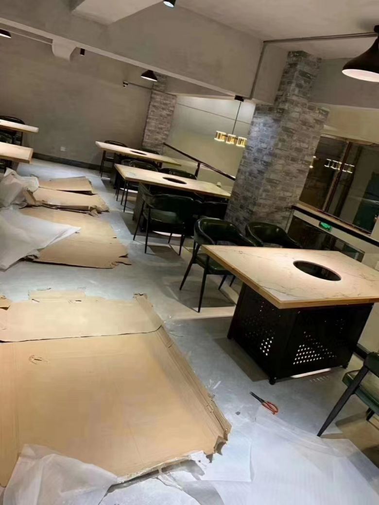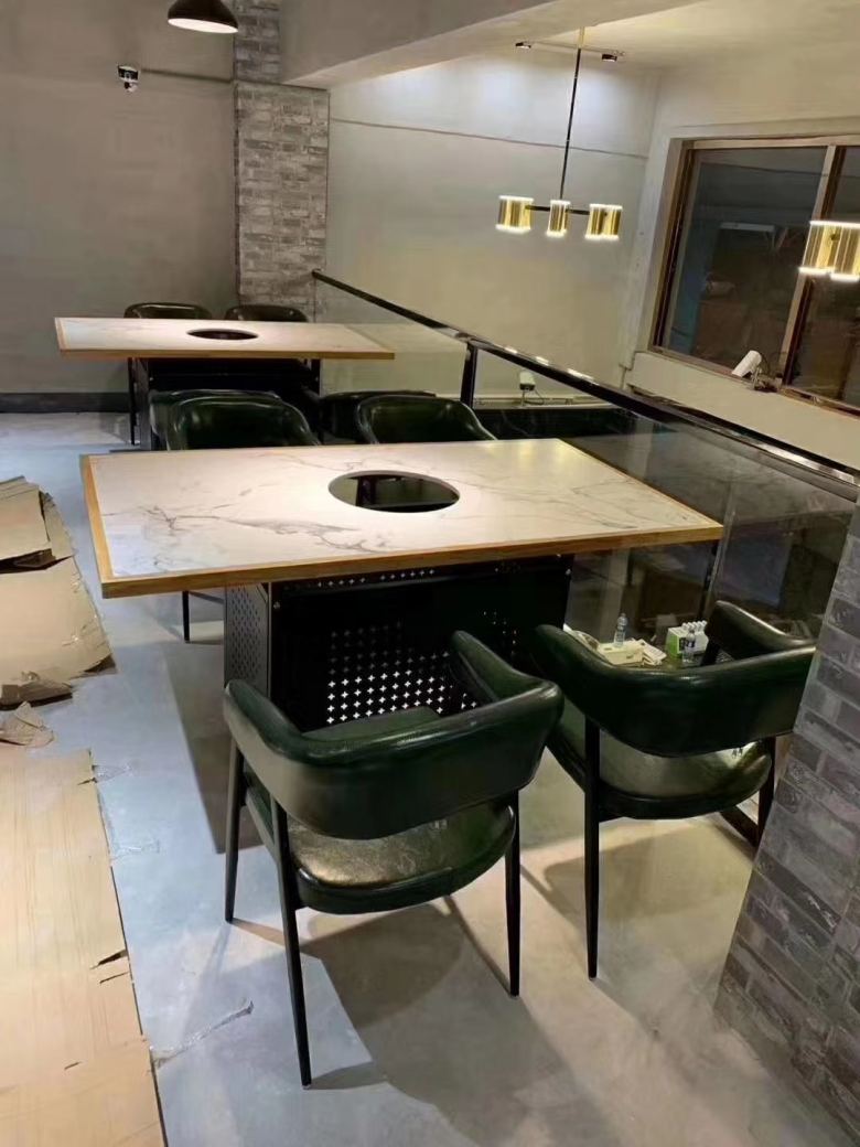 该店定做的火锅桌为大理石台面无烟火锅桌,博菲克定制家具厂技术团队经过改良,使得外观更时尚大气,座椅采用优质海绵软包,舒适性更强。