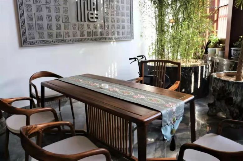 经过多次沟通和讨论,神木乾茂饭店宴会厅桌椅均采用中式风格,餐椅选用官帽椅,整体实木结构榫卯工艺。餐桌方面,为了考虑实用性和控制成本预算,最终敲定使用带玻璃转盘的圆桌,另外,根据空间的需要,在部分休息接待室配套了几套茶台供顾客喝茶使用。