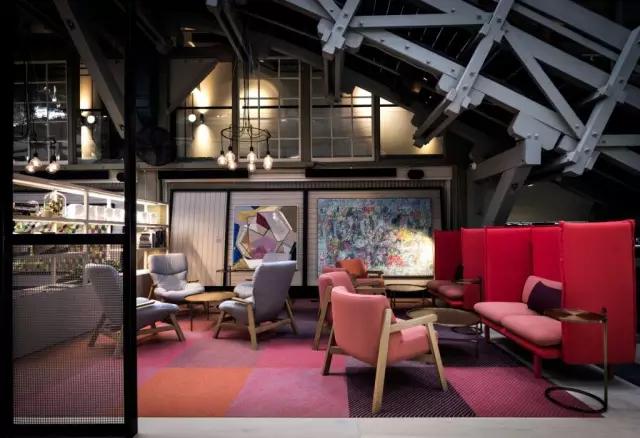 OW的设计灵感来自大自然,设计师用以打造集古典情怀与现代奢华于一身的旅店内部。大厅依旧保留了旧厂房的格局,裸露钢筋的三角结构,如温室般的玻璃屋,屋中屋设计式样的简约柜台,支撑一楼空间的黑色钢骨及原木建材,无一不散发着带有高雅气息的工业风格,同时有兼具了时尚气质。这里所有的元素,都粗犷而豪放,像极了穿着黑色西装打着领带的禁欲系男人。但一切黑色钢铁透明玻璃又都巧妙融于采光明亮的空间里,带了些许柔和的色彩。然而公共休息区的酒吧、咖啡室、餐厅采用鲜艳的色彩,并通过简约的细节做区隔。在室内,随处可见郁郁葱葱的绿色植物和树木,点缀于各个角落。